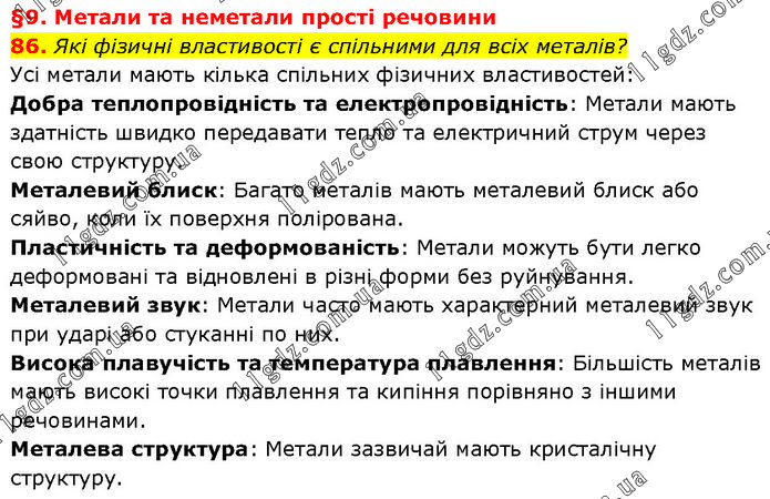 §9. Метали та неметали прості речовини 86. Які фізичні властивості є спільними для всіх металів? Усі метали мають кілька спільних фізичних властивостей: Добра теплопровідність та електропровідність: Метали мають здатність швидко передавати тепло та електричний струм через свою структуру. Металевий блиск: Багато металів мають металевий блиск або сяйво, коли їх поверхня полірована. Пластичність та деформованість: Метали можуть бути легко деформовані та відновлені в різні форми без руйнування. Металевий звук: Метали часто мають характерний металевий звук при ударі або стуканні по них. Висока плавучість та температура плавлення: Більшість металів мають високі точки плавлення та кипіння порівняно з іншими речовинами. Металева структура: Метали зазвичай мають кристалічну структуру.
