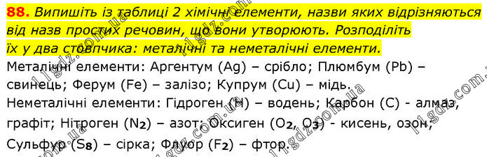 Випишіть із таблиці 2 хімічні елементи, назви яких відрізняються від назв простих речовин, що вони утворюють. Розподіліть їх у два стовпчика: металічні та неметалічні елементи. Металічні елементи: Аргентум (Ag) – срібло; Плюмбум (Pb) – свинець; Ферум (Fe) – залізо; Купрум (Cu) – мідь. Неметалічні елементи: Гідроген (H) – водень; Карбон (C) - алмаз, графіт; Нітроген (N2) – азот; Оксиген (O2, O3) - кисень, озон; Сульфур (S8) – сірка; Флуор (F2) – фтор.