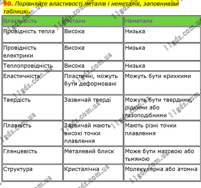 Порівняйте властивості металів і неметалів, заповнивши таблицю. Властивість Метали Неметали Провідність тепла Висока Низька Провідність електрики Висока Низька Теплопровідність Висока Низька Еластичність Пластичні, можуть бути деформовані Можуть бути крихкими Твердість Зазвичай тверді Можуть бути твердими, рідкими або газоподібними Плавність Зазвичай мають високі точки плавлення Мають різні точки плавлення Глянцевість Металевий блиск Може бути матовою або тьмяною Структура Кристалічна Молекулярна або атомна