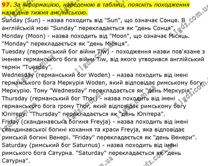 За інформацією, наведеною в таблиці, поясніть походження назв днів тижня англійською. Sunday (Sun) - назва походить від "Sun", що означає Сонце. В англійській мові "Sunday" перекладається як "день Сонця". Monday (Moon) - назва походить від "Moon", що означає Місяць. "Monday" перекладається як "день Місяця". Tuesday (германський бог війни Tiw) - походження назви пов'язане з іменем германського бога війни Tiw, від якого утворився англійський термін "Tuesday". Wednesday (германський бог Woden) - назва походить від імені германського бога Меркурія Woden, який відповідає римському богу Меркурію. Тому "Wednesday" перекладається як "день Меркурія". Thursday (германський бог Thor) - назва походить від імені германського бога грому Thor, який відповідає римському богу Юпітеру. "Thursday" перекладається як "день Юпітера". Friday (скандинавська богиня Freyja) - назва походить від імені скандинавської богині кохання та краси Freyja, яка відповідає римській богині Венері. "Friday" перекладається як "день Венери". Saturday (римський бог Saturnus) - назва походить від імені римського бога Сатурна. "Saturday" перекладається як "день Сатурна".