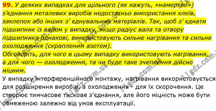 У деяких випадках для щільного (як кажуть, «намертво») з’єднання металевих виробів недостатньо використання клеїв, заклепок або інших з’ єднувальних матеріалів. Так, щоб з’ єднати підшипник із валом у випадку, якщо радіус вала та отвору підшипника однакові, використовують сильне нагрівання та сильне охолодження (скрапленим азотом). Обговоріть, для чого в цьому випадку використовують нагрівання, а для чого — охолодження, та чи буде таке зчеплення дійсно міцним. У випадку інтерференційного монтажу, нагрівання використовується для розширення виробів, а охолодження - для їх скорочення. Це створює тимчасове тискове з'єднання, але його міцність може бути обмеженою залежно від умов експлуатації.