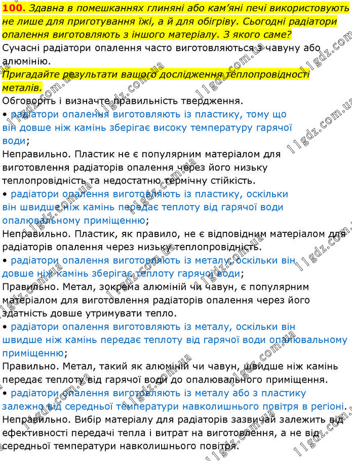 Здавна в помешканнях глиняні або кам’яні печі використовують не лише для приготування їжі, а й для обігріву. Сьогодні радіатори опалення виготовляють з іншого матеріалу. З якого саме? Сучасні радіатори опалення часто виготовляються з чавуну або алюмінію. Пригадайте результати вашого дослідження теплопровідності металів. Обговоріть і визначте правильність твердження. • радіатори опалення виготовляють із пластику, тому що він довше ніж камінь зберігає високу температуру гарячої води; Неправильно. Пластик не є популярним матеріалом для виготовлення радіаторів опалення через його низьку теплопровідність та недостатню термічну стійкість. • радіатори опалення виготовляють із пластику, оскільки він швидше ніж камінь передає теплоту від гарячої води опалювальному приміщенню; Неправильно. Пластик, як правило, не є відповідним матеріалом для радіаторів опалення через низьку теплопровідність. • радіатори опалення виготовляють із металу, оскільки він довше ніж камінь зберігає теплоту гарячої води; Правильно. Метал, зокрема алюміній чи чавун, є популярним матеріалом для виготовлення радіаторів опалення через його здатність довше утримувати тепло. • радіатори опалення виготовляють із металу, оскільки він швидше ніж камінь передає теплоту від гарячої води опалювальному приміщенню; Правильно. Метал, такий як алюміній чи чавун, швидше ніж камінь передає теплоту від гарячої води до опалювального приміщення. • радіатори опалення виготовляють із металу або з пластику залежно від середньої температури навколишнього повітря в регіоні. Неправильно. Вибір матеріалу для радіаторів зазвичай залежить від ефективності передачі тепла і витрат на виготовлення, а не від середньої температури навколишнього повітря.