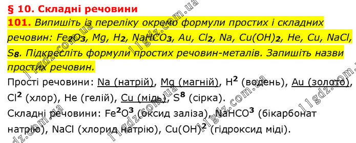 § 10. Складні речовини 101. Випишіть із переліку окремо формули простих і складних речовин: Fe2O3, Mg, H2, NaHCO3, Au, Cl2, Na, Cu(OH)2, He, Cu, NaCl, S8. Підкресліть формули простих речовин-металів. Запишіть назви простих речовин. Прості речовини: Na (натрій), Mg (магній), H2 (водень), Au (золото), Cl2 (хлор), He (гелій), Cu (мідь), S8 (сірка). Складні речовини: Fe2O3 (оксид заліза), NaHCO3 (бікарбонат натрію), NaCl (хлорид натрію), Cu(OH)2 (гідроксид міді).