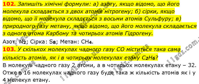102. Запишіть хімічні формули: а) азоту, якщо відомо, що його молекула складається з двох атомів нітрогену; б) сірки, якщо відомо, що її молекула складється з восьми атомів Сульфуру; в) природного газу метану, якщо відомо, що його молекула складається з одного атома Карбону та чотирьох атомів Гідрогену. Азот: N2; Сірка: S8; Метан: CH4. 103. У скількох молекулах чадного газу CO міститься така сама кількість атомів, як і в чотирьох молекулах етану С2Н6? В молекулі чадного газу 2 атоми, а в чотирьох молекулах етану – 32. Отже в 16 молекулах чадного газу буде така ж кількість атомів як і у 4 молекул етану.