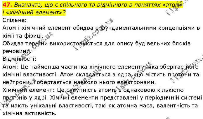 Визначте, що є спільного та відмінного в поняттях «атом» і «хімічний елемент»? Спільне: Атом і хімічний елемент обидва є фундаментальними концепціями в хімії та фізиці. Обидва терміни використовуються для опису будівельних блоків речовини. Відмінності: Атом: Це найменша частинка хімічного елементу, яка зберігає його хімічні властивості. Атом складається з ядра, що містить протони та нейтрони, і обертається навколо нього електронами. Хімічний елемент: Це сукупність атомів з однаковою кількістю протонів у ядрі. Хімічні елементи представлені у періодичній системі та мають унікальні властивості, такі як атомна маса, валентність та хімічна активність.