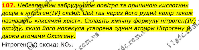 Небезпечним забрудником повітря та причиною кислотних дощів є нітроген(IV) оксид. Цей газ через його рудий колір також називають «лисячий хвіст». Складіть хімічну формулу нітроген(IV) оксиду, якщо його молекула утворена одним атомом Нітрогену й двома атомами Оксигену. Нітроген(IV) оксид: NO2.