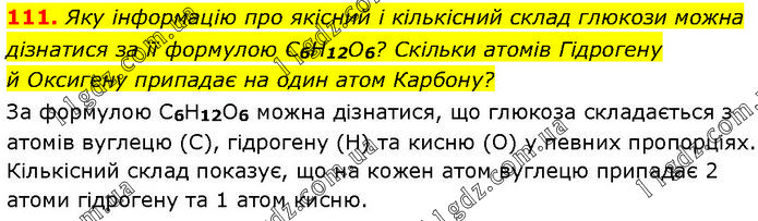 Яку інформацію про якісний і кількісний склад глюкози можна дізнатися за її формулою C6H12O6? Скільки атомів Гідрогену й Оксигену припадає на один атом Карбону? За формулою C6H12O6 можна дізнатися, що глюкоза складається з атомів вуглецю (C), гідрогену (H) та кисню (O) у певних пропорціях. Кількісний склад показує, що на кожен атом вуглецю припадає 2 атоми гідрогену та 1 атом кисню.