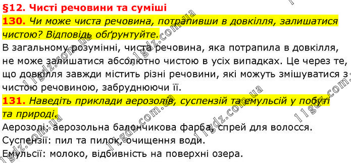 §12. Чисті речовини та суміші 1З0. Чи може чиста речовина, потрапивши в довкілля, залишатися чистою? Відповідь обґрунтуйте. В загальному розумінні, чиста речовина, яка потрапила в довкілля, не може залишатися абсолютно чистою в усіх випадках. Це через те, що довкілля завжди містить різні речовини, які можуть змішуватися з чистою речовиною, забруднюючи її. 131. Наведіть приклади аерозолів, суспензій та емульсій у побуті та природі. Аерозолі: аерозольна балончикова фарба, спрей для волосся. Суспензії: пил та пилок, очищення води. Емульсії: молоко, відбивність на поверхні озера.