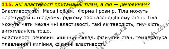 Які властивості притаманні тілам, а які — речовинам? Властивості тіл: Маса і об'єм. Форма і розмір. Тіла можуть перебувати в твердому, рідкому або газоподібному стані. Тіла можуть мати механічні властивості, такі як твердість, гнучкість, витягуваність тощо. Властивості речовин: хімічний склад, фізичний стан, температура плавлення і кипіння, фізичні властивості.
