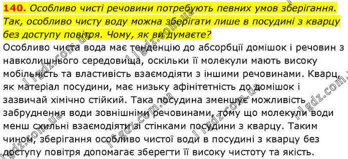 Особливо чисті речовини потребують певних умов зберігання. Так, особливо чисту воду можна зберігати лише в посудині з кварцу без доступу повітря. Чому, як ви думаєте? Особливо чиста вода має тенденцію до абсорбції домішок і речовин з навколишнього середовища, оскільки її молекули мають високу мобільність та властивість взаємодіяти з іншими речовинами. Кварц, як матеріал посудини, має низьку афінітетність до домішок і зазвичай хімічно стійкий. Така посудина зменшує можливість забруднення води зовнішніми речовинами, тому що молекули води менш схильні взаємодіяти зі стінками посудини з кварцу. Таким чином, зберігання особливо чистої води в посудині з кварцу без доступу повітря допомагає зберегти її високу чистоту та якість.
