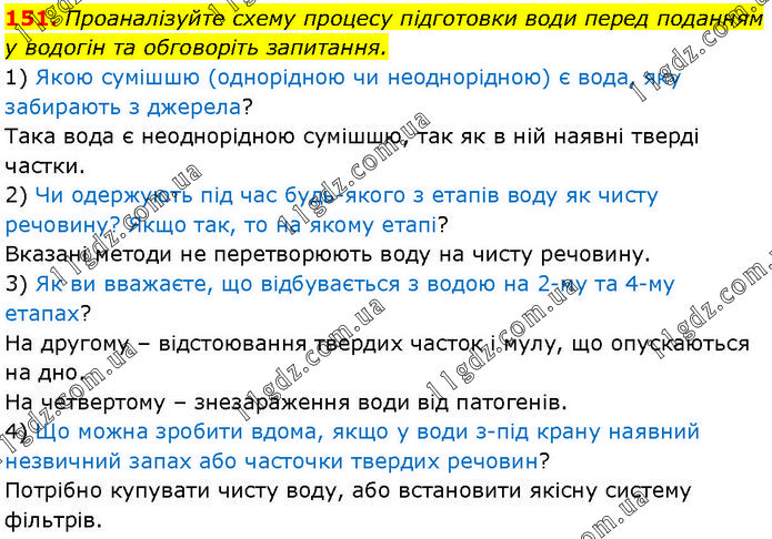 Проаналізуйте схему процесу підготовки води перед поданням у водогін та обговоріть запитання. 1) Якою сумішшю (однорідною чи неоднорідною) є вода, яку забирають з джерела? Така вода є неоднорідною сумішшю, так як в ній наявні тверді частки. 2) Чи одержують під час будь-якого з етапів воду як чисту речовину? Якщо так, то на якому етапі? Вказані методи не перетворюють воду на чисту речовину. 3) Як ви вважаєте, що відбувається з водою на 2-му та 4-му етапах? На другому – відстоювання твердих часток і мулу, що опускаються на дно. На четвертому – знезараження води від патогенів. 4) Що можна зробити вдома, якщо у води з-під крану наявний незвичний запах або часточки твердих речовин? Потрібно купувати чисту воду, або встановити якісну систему фільтрів.