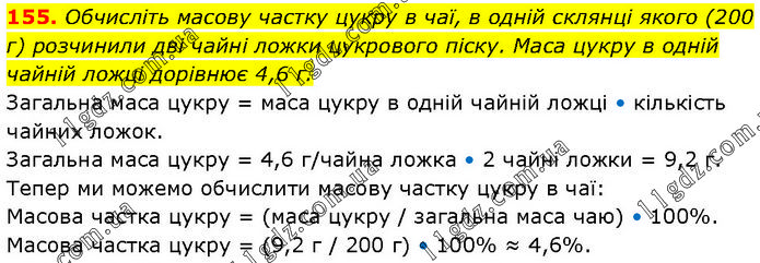 Обчисліть масову частку цукру в чаї, в одній склянці якого (200 г) розчинили дві чайні ложки цукрового піску. Маса цукру в одній чайній ложці дорівнює 4,6 г. Загальна маса цукру = маса цукру в одній чайній ложці • кількість чайних ложок. Загальна маса цукру = 4,6 г/чайна ложка • 2 чайні ложки = 9,2 г. Тепер ми можемо обчислити масову частку цукру в чаї: Масова частка цукру = (маса цукру / загальна маса чаю) • 100%. Масова частка цукру = (9,2 г / 200 г) • 100% ≈ 4,6%.
