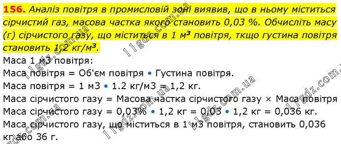 Аналіз повітря в промисловій зоні виявив, що в ньому міститься сірчистий газ, масова частка якого становить 0,03 %. Обчисліть масу (г) сірчистого газу, що міститься в 1 м3 повітря, ткщо густина повітря становить 1,2 кг/м3. Маса 1 м3 повітря: Маса повітря = Об'єм повітря • Густина повітря. Маса повітря = 1 м3 • 1.2 кг/м3 = 1,2 кг. Маса сірчистого газу = Масова частка сірчистого газу × Маса повітря Маса сірчистого газу = 0,03% • 1,2 кг = 0,03 • 1,2 кг = 0,036 кг. Маса сірчистого газу, що міститься в 1 м3 повітря, становить 0,036 кг або 36 г.