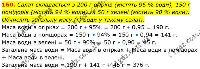 Салат складається з 200 г огірків (містять 95 % води), 150 г помідорів (містять 94 % води) та 50 г зелені (містить 90 % води). Обчисліть загальну масу (г) води у такому салаті. Маса води в огірках = 200 г • 95% = 200 г • 0,95 = 190 г. Маса води в помідорах = 150 г • 94% = 150 г • 0,94 = 141 г. Маса води в зелені = 50 г • 90% = 50 г • 0,90 = 45 г. Загальна маса води = Маса води в огірках + Маса води в помідорах + Маса води в зелені. Загальна маса води = 190 г + 141 г + 45 г = 376 г.