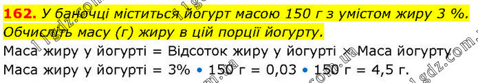 У баночці міститься йогурт масою 150 г з умістом жиру 3 %. Обчисліть масу (г) жиру в цій порції йогурту. Маса жиру у йогурті = Відсоток жиру у йогурті × Маса йогурту Маса жиру у йогурті = 3% • 150 г = 0,03 • 150 г = 4,5 г.