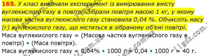 У класі виконали експеримент із вимірювання вмісту вуглекислого газу в повітрі. Зібрали повітря масою 1 кг, у якому масова частка вуглекислого газу становила 0,04 %. Обчисліть масу (г) вуглекислого газу, що міститься в зібраному об’ємі повітрі. Маса вуглекислого газу = (Масова частка вуглекислого газу в повітрі) • (Маса повітря). Маса вуглекислого газу = 0,04% • 1000 г = 0,04 • 1000 г = 40 г.