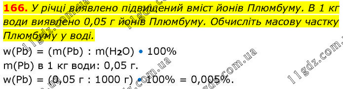 У річці виявлено підвищений вміст йонів Плюмбуму. В 1 кг води виявлено 0,05 г йонів Плюмбуму. Обчисліть масову частку Плюмбуму у воді. w(Pb) = (m(Pb) : m(H2O) • 100% m(Pb) в 1 кг води: 0,05 г. w(Pb) = (0,05 г : 1000 г) • 100% = 0,005%.