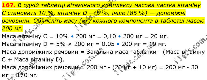 В одній таблетці вітамінного комплексу масова частка вітаміну С становить 10 %, вітаміну D — 5 %, інше (85 %) — допоміжні речовини. Обчисліть масу (мг) кожного компонента в таблетці масою 200 мг. Маса вітаміну C = 10% • 200 мг = 0,10 • 200 мг = 20 мг. Маса вітаміну D = 5% × 200 мг = 0,05 • 200 мг = 10 мг. Маса допоміжних речовин = Загальна маса таблетки - (Маса вітаміну C + Маса вітаміну D). Маса допоміжних речовин = 200 мг - (20 мг + 10 мг) = 200 мг - 30 мг = 170 мг.