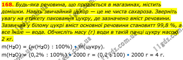 Будь-яка речовина, що продається в магазинах, містить домішки. Навіть звичайний цукор — це не чиста сахароза. Зверніть увагу на етикету паковання цукру, де зазначено вміст речовини. Зазвичай у білому цукрі вміст основної речовини становитт 99,8 %, а все інше — вода. Обчисліть масу (г) води в такій пачці цукру масою 2 кг. m(H2O) = (w(H2O) : 100%) • m(цукру). m(H2O) = (0,2% : 100%) • 2000 г = (0,2 : 100) • 2000 г = 4 г.