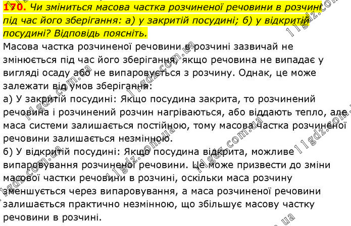 Чи зміниться масова частка розчиненої речовини в розчині під час його зберігання: а) у закритій посудині; б) у відкритій посудині? Відповідь поясніть. Масова частка розчиненої речовини в розчині зазвичай не змінюється під час його зберігання, якщо речовина не випадає у вигляді осаду або не випаровується з розчину. Однак, це може залежати від умов зберігання: а) У закритій посудині: Якщо посудина закрита, то розчинений речовина і розчинений розчин нагріваються, або віддають тепло, але маса системи залишається постійною, тому масова частка розчиненої речовини залишається незмінною. б) У відкритій посудині: Якщо посудина відкрита, можливе випаровування розчиненої речовини. Це може призвести до зміни масової частки речовини в розчині, оскільки маса розчину зменшується через випаровування, а маса розчиненої речовини залишається практично незмінною, що збільшує масову частку речовини в розчині.