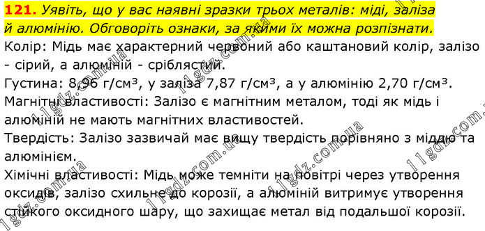 Уявіть, що у вас наявні зразки трьох металів: міді, заліза й алюмінію. Обговоріть ознаки, за якими їх можна розпізнати. Колір: Мідь має характерний червоний або каштановий колір, залізо - сірий, а алюміній - сріблястий. Густина: 8,96 г/см³, у заліза 7,87 г/см³, а у алюмінію 2,70 г/см³. Магнітні властивості: Залізо є магнітним металом, тоді як мідь і алюміній не мають магнітних властивостей. Твердість: Залізо зазвичай має вищу твердість порівняно з міддю та алюмінієм. Хімічні властивості: Мідь може темніти на повітрі через утворення оксидів, залізо схильне до корозії, а алюміній витримує утворення стійкого оксидного шару, що захищає метал від подальшої корозії.