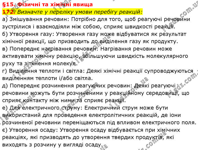 §15. Фізичні та хімічні явища 172. Визначте у переліку умови перебігу реакцій: а) Змішування речовин: Потрібно для того, щоб реагуючі речовини зустрілися і взаємодіяли між собою, сприяє швидкості реакції. б) Утворення газу: Утворення газу може відбуватися як результат хімічної реакції, що призводить до виділення газу як продукту. в) Попереднє нагрівання речовин: Нагрівання речовин може активувати хімічну реакцію, збільшуючи швидкість молекулярного руху та зіткнення молекул. г) Виділення теплоти і світла: Деякі хімічні реакції супроводжуються виділенням теплоти і/або світла. д) Попереднє розчинення реагуючих речовин: Деякі реагуючі речовини можуть бути розчиненими у реакційному середовищі, що сприяє контакту між ними та сприяє реакції. е) Для електричного струму: Електричний струм може бути використаний для проведення електролітичних реакцій, де іони розчиненої речовини переміщаються під впливом електричного поля. є) Утворення осаду: Утворення осаду відбувається при хімічних реакціях, які призводять до утворення твердих продуктів, які виходять з розчину у вигляді осаду.