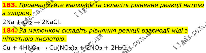 183. Проаналізуйте малюнок та складіть рівняння реакції натрію з хлором. 2Na + Cl2 → 2NaCl. 184. За малюнком складіть рівняння реакції взаємодії міді з нітратною кислотою. Cu + 4HNO3 → Cu(NO3)2 + 2NO2 + 2H2O.