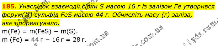 Унаслідок взаємодії сірки S масою 16 г із залізом Fe утворився ферум(ІІ) сульфід FeS масою 44 г. Обчисліть масу (г) заліза, яке прореагувало. m(Fe) = m(FeS) − m(S). m (Fe) = 44 г − 16 г = 28 г.