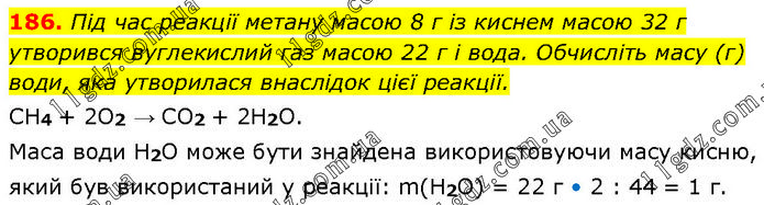 Під час реакції метану масою 8 г із киснем масою 32 г утворився вуглекислий газ масою 22 г і вода. Обчисліть масу (г) води, яка утворилася внаслідок цієї реакції. CH4 + 2O2 → CO2 + 2H2O. Маса води Н2О може бути знайдена використовуючи масу кисню, який був використаний у реакції: m(Н2О) = 22 г • 2 : 44 = 1 г.