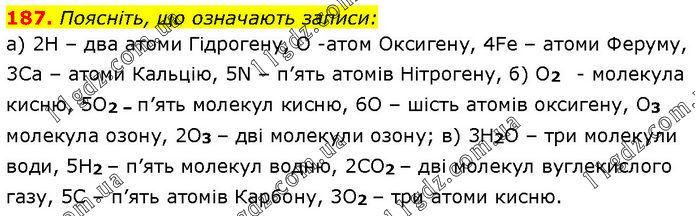 Поясніть, що означають записи: а) 2H – два атоми Гідрогену, O –атом Оксигену, 4Fe – атоми Феруму, 3Ca – атоми Кальцію, 5N – п’ять атомів Нітрогену, б) O2 – молекула кисню, 5O2 – п’ять молекул кисню, 6O – шість атомів оксигену, O3 молекула озону, 2O3 – дві молекули озону; в) 3H2O – три молекули води, 5H2 – п’ять молекул водню, 2CO2 – дві молекул вуглекислого газу, 5С – п’ять атомів Карбону, 3О2 – три атоми кисню.