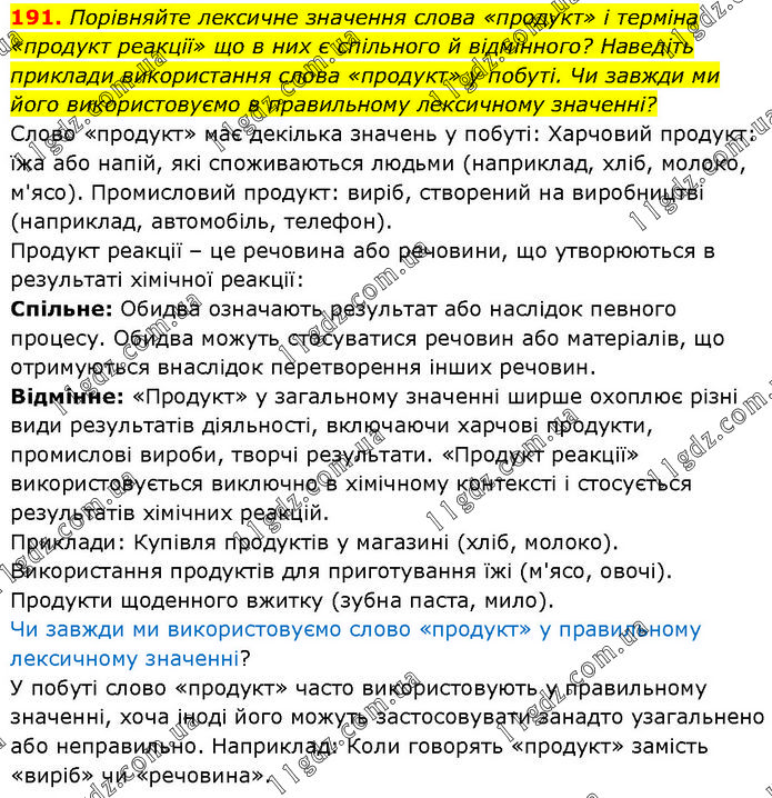 Порівняйте лексичне значення слова «продукт» і терміна «продукт реакції» що в них є спільного й відмінного? Наведіть приклади використання слова «продукт» у побуті. Чи завжди ми його використовуємо в правильному лексичному значенні? Слово «продукт» має декілька значень у побуті: Харчовий продукт: їжа або напій, які споживаються людьми (наприклад, хліб, молоко, м'ясо). Промисловий продукт: виріб, створений на виробництві (наприклад, автомобіль, телефон). Продукт реакції – це речовина або речовини, що утворюються в результаті хімічної реакції: Спільне: Обидва означають результат або наслідок певного процесу. Обидва можуть стосуватися речовин або матеріалів, що отримуються внаслідок перетворення інших речовин. Відмінне: «Продукт» у загальному значенні ширше охоплює різні види результатів діяльності, включаючи харчові продукти, промислові вироби, творчі результати. «Продукт реакції» використовується виключно в хімічному контексті і стосується результатів хімічних реакцій. Приклади: Купівля продуктів у магазині (хліб, молоко). Використання продуктів для приготування їжі (м'ясо, овочі). Продукти щоденного вжитку (зубна паста, мило). Чи завжди ми використовуємо слово «продукт» у правильному лексичному значенні? У побуті слово «продукт» часто використовують у правильному значенні, хоча іноді його можуть застосовувати занадто узагальнено або неправильно. Наприклад: Коли говорять «продукт» замість «виріб» чи «речовина».