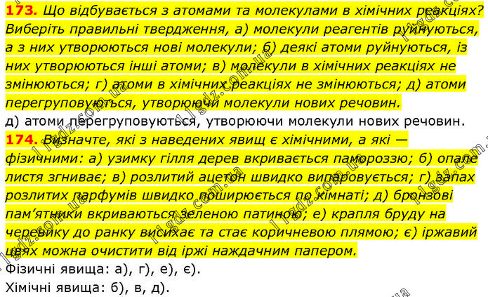173. Що відбувається з атомами та молекулами в хімічних реакціях? Виберіть правильні твердження, а) молекули реагентів руйнуються, а з них утворюються нові молекули; б) деякі атоми руйнуються, із них утворюються інші атоми; в) молекули в хімічних реакціях не змінюються; г) атоми в хімічних реакціях не змінюються; д) атоми перегруповуються, утворюючи молекули нових речовин. д) атоми перегруповуються, утворюючи молекули нових речовин. 174. Визначте, які з наведених явищ є хімічними, а які — фізичними: а) узимку гілля дерев вкривається памороззю; б) опале листя згниває; в) розлитий ацетон швидко випаровується; г) запах розлитих парфумів швидко поширюється по кімнаті; д) бронзові пам’ятники вкриваються зеленою патиною; е) крапля бруду на черевику до ранку висихає та стає коричневою плямою; є) іржавий цвях можна очистити від іржі наждачним папером. Фізичні явища: а), г), е), є). Хімічні явища: б), в, д).