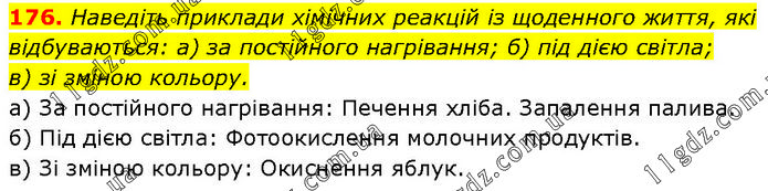 Наведіть приклади хімічних реакцій із щоденного життя, які відбуваються: а) за постійного нагрівання; б) під дією світла; в) зі зміною кольору. а) За постійного нагрівання: Печення хліба. Запалення палива. б) Під дією світла: Фотоокислення молочних продуктів. в) Зі зміною кольору: Окиснення яблук.