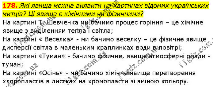 Які явища можна виявити на картинах відомих українських митців? Ці явища є хімічними чи фізичними? На картині Т. Шевченка ми бачимо процес горіння – це хімічне явище з виділенням тепла і світла; На картині «Веселка» – ми бачимо веселку – це фізичне явище дисперсії світла в маленьким краплинках води в повітрі; На картині «Туман» – бачимо фізичне, явище атмосферні опади –туман; На картині «Осінь» – ми бачимо хімічне явище перетворення хлоропластів в листках на хромопласти зі зміною кольору.