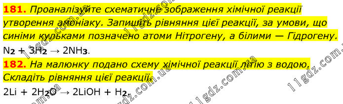 181. Проаналізуйте схематичне зображення хімічної реакції утворення амоніаку. Запишіть рівняння цієї реакції, за умови, що синіми кульками позначено атоми Нітрогену, а білими — Гідрогену. N2 + 3H2 → 2NH3. 182. На малюнку подано схему хімічної реакції літію з водою. Складіть рівняння цієї реакції. 2Li + 2H2O → 2LiOH + H2.