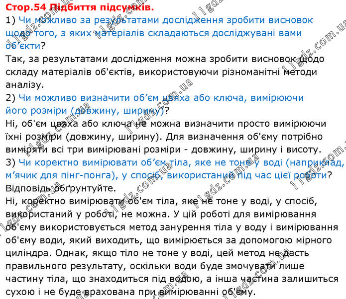 Стор.54 Підбиття підсумків. 1) Чи можливо за результатами дослідження зробити висновок щодо того, з яких матеріалів складаються досліджувані вами об’єкти? Так, за результатами дослідження можна зробити висновок щодо складу матеріалів об'єктів, використовуючи різноманітні методи аналізу. 2) Чи можливо визначити об’єм цвяха або ключа, вимірюючи його розміри (довжину, ширину)? Ні, об'єм цвяха або ключа не можна визначити просто вимірюючи їхні розміри (довжину, ширину). Для визначення об'єму потрібно виміряти всі три вимірювані розміри - довжину, ширину і висоту. 3) Чи коректно вимірювати об’єм тіла, яке не тоне у воді (наприклад, м’ячик для пінг-понга), у спосіб, використаний під час цієї роботи? Відповідь обґрунтуйте. Ні, коректно вимірювати об'єм тіла, яке не тоне у воді, у спосіб, використаний у роботі, не можна. У цій роботі для вимірювання об'єму використовується метод занурення тіла у воду і вимірювання об'єму води, який виходить, що вимірюється за допомогою мірного циліндра. Однак, якщо тіло не тоне у воді, цей метод не дасть правильного результату, оскільки води буде змочувати лише частину тіла, що знаходиться під водою, а інша частина залишиться сухою і не буде врахована при вимірюванні об'єму.