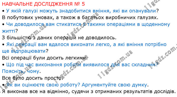 НАВЧАЛЬНЕ ДОСЛІДЖЕННЯ № 5 • У якій галузі можуть знадобитися вміння, які ви опанували? В побутових умовах, а також в багатьох виробничих галузях. • Чи доводилося вам стикатися з такими операціями в щоденному житті? З більшістю з даних операцій не доводилось. • Які операції вам вдалося виконати легко, а які вміння потрібно ще відпрацювати? Всі операції були досить легкими. • Що під час виконання роботи виявилося для вас складним? Поясніть, чому. Все було досить просто. • Як ви оцінюєте свою роботу? Аргументуйте свою думку. Я виконав все на відмінно, судячи з отриманих результатів дослідів.