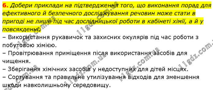 Добери приклади на підтвердження того, що виконання порад для ефективного й безпечного досліджування речовин може стати в пригоді не лише під час дослідницької роботи в кабінеті хімії, а й у повсякденні. – Використання рукавичок та захисних окулярів під час роботи з побутовою хімією. – Провітрювання приміщення після використання засобів для чищення. – Зберігання хімічних засобів у недоступних для дітей місцях. – Сортування та правильне утилізування відходів для зменшення шкоди навколишньому середовищу.