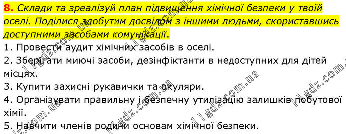 Склади та зреалізуй план підвищення хімічної безпеки у твоїй оселі. Поділися здобутим досвідом з іншими людьми, скориставшись доступними засобами комунікації. 1. Провести аудит хімічних засобів в оселі. 2. Зберігати миючі засоби, дезінфіктанти в недоступних для дітей місцях. 3. Купити захисні рукавички та окуляри. 4. Організувати правильну і безпечну утилізацію залишків побутової хімії. 5. Навчити членів родини основам хімічної безпеки.