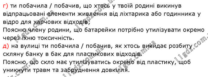 г) ти побачила / побачив, що хтось у твоїй родині викинув відпрацьовані елементи живлення від ліхтарика або годинника у відро для харчових відходів; Поясню члену родини, що батарейки потрібно утилізувати окремо через їхню токсичність. д) на вулиці ти побачила / побачив, як хтось викидає розбиту скляну банку в бак для пластикових відходів. Поясню, що скло має утилізуватись окремо від пластику, щоб уникнути травм та забруднення довкілля.