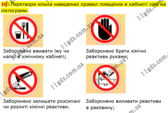 Перетвори кілька наведених правил поведінки в кабінеті хімії на піктограми. Заборонено вживати їжу чи напої в хімічному кабінеті; Заборонено брати хімічні реактиви руками; Заборонено залишати розсипані чи розлиті хімічні реактиви. Заборонено виливати реактиви в раковину;