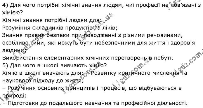 4) Для чого потрібні хімічні знання людям, чиї професії не пов’язані з хімією? Хімічні знання потрібні людям для: Розуміння складників продуктів та ліків; Знання правил безпеки при поводженні з різними речовинами, особливо тими, які можуть бути небезпечними для життя і здоров'я людини; Використання елементарних хімічних перетворень в побуті. 5) Для чого в школі вивчають хімію? Хімію в школі вивчають для: – Розвитку критичного мислення та наукового підходу до життя; – Розуміння основних принципів і процесів, що відбуваються в природі; – Підготовки до подальшого навчання та професійної діяльності.