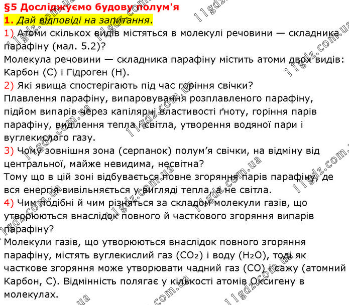 §5 Досліджуємо будову полум'я 1. Дай відповіді на запитання. 1) Атоми скількох видів містяться в молекулі речовини — складника парафіну (мал. 5.2)? Молекула речовини — складника парафіну містить атоми двох видів: Карбон (C) і Гідроген (H). 2) Які явища спостерігають під час горіння свічки? Плавлення парафіну, випаровування розплавленого парафіну, підйом випарів через капілярні властивості ґноту, горіння парів парафіну, виділення тепла і світла, утворення водяної пари і вуглекислого газу. 3) Чому зовнішня зона (серпанок) полум’я свічки, на відміну від центральної, майже невидима, несвітна? Тому що в цій зоні відбувається повне згоряння парів парафіну, де вся енергія вивільняється у вигляді тепла, а не світла. 4) Чим подібні й чим різняться за складом молекули газів, що утворюються внаслідок повного й часткового згоряння випарів парафіну? Молекули газів, що утворюються внаслідок повного згоряння парафіну, містять вуглекислий газ (CO₂) і воду (H₂O), тоді як часткове згоряння може утворювати чадний газ (CO) і сажу (атомний Карбон, C). Відмінність полягає у кількості атомів Оксигену в молекулах.