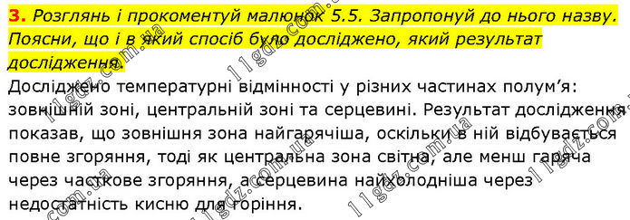 Розглянь і прокоментуй малюнок 5.5. Запропонуй до нього назву. Поясни, що і в який спосіб було досліджено, який результат дослідження. Досліджено температурні відмінності у різних частинах полум’я: зовнішній зоні, центральній зоні та серцевині. Результат дослідження показав, що зовнішня зона найгарячіша, оскільки в ній відбувається повне згоряння, тоді як центральна зона світна, але менш гаряча через часткове згоряння, а серцевина найхолодніша через недостатність кисню для горіння.