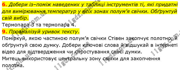 6. Добери із–поміж наведених у таблиці інструментів ті, які придатні для вимірювання температур у всіх зонах полум’я свічки. Обґрунтуй свій вибір. Термопара 3 та термопара 4. 9. Проаналізуй уривок тексту. Поміркуй, якою частиною полум’я свічки Стівен закопчує полотно, й обґрунтуй свою думку. Добери ключові слова й відшукай в інтернеті відео для підтвердження чи спростування своєї думки. Митець використовує центральну зону свічки для закопчення полотна.