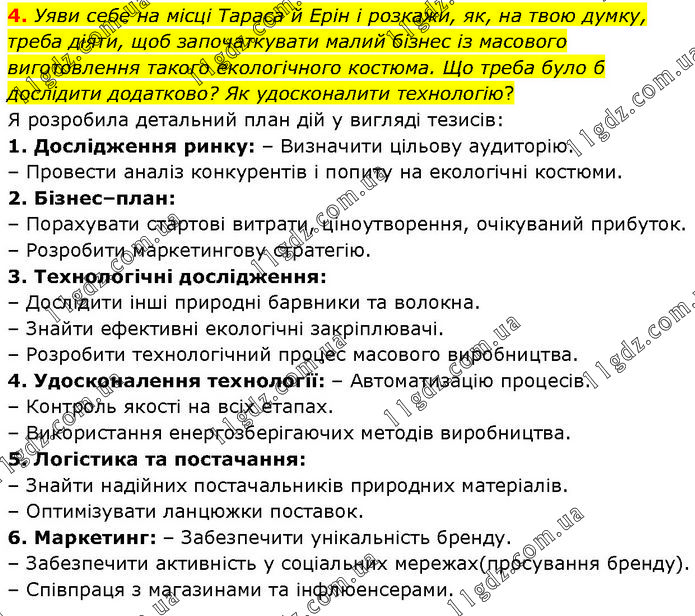 Уяви себе на місці Тараса й Ерін і розкажи, як, на твою думку, треба діяти, щоб започаткувати малий бізнес із масового виготовлення такого екологічного костюма. Що треба було б дослідити додатково? Як удосконалити технологію? Я розробила детальний план дій у вигляді тезисів: 1. Дослідження ринку: – Визначити цільову аудиторію. – Провести аналіз конкурентів і попиту на екологічні костюми. 2. Бізнес–план: – Порахувати стартові витрати, ціноутворення, очікуваний прибуток. – Розробити маркетингову стратегію. 3. Технологічні дослідження: – Дослідити інші природні барвники та волокна. – Знайти ефективні екологічні закріплювачі. – Розробити технологічний процес масового виробництва. 4. Удосконалення технології: – Автоматизацію процесів. – Контроль якості на всіх етапах. – Використання енергозберігаючих методів виробництва. 5. Логістика та постачання: – Знайти надійних постачальників природних матеріалів. – Оптимізувати ланцюжки поставок. 6. Маркетинг: – Забезпечити унікальність бренду. – Забезпечити активність у соціальних мережах(просування бренду). – Співпраця з магазинами та інфлюенсерами.