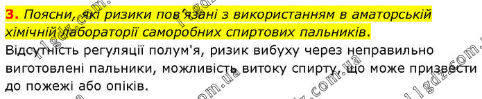 Поясни, які ризики пов’язані з використанням в аматорській хімічній лабораторії саморобних спиртових пальників. Відсутність регуляції полум'я, ризик вибуху через неправильно виготовлені пальники, можливість витоку спирту, що може призвести до пожежі або опіків.