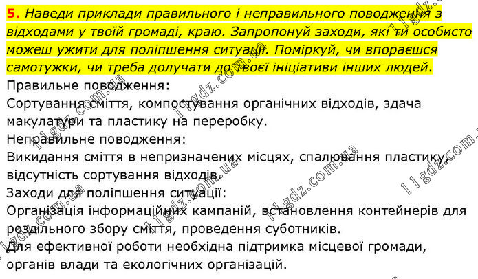 Наведи приклади правильного і неправильного поводження з відходами у твоїй громаді, краю. Запропонуй заходи, які ти особисто можеш ужити для поліпшення ситуації. Поміркуй, чи впораєшся самотужки, чи треба долучати до твоєї ініціативи інших людей. Правильне поводження: Сортування сміття, компостування органічних відходів, здача макулатури та пластику на переробку. Неправильне поводження: Викидання сміття в непризначених місцях, спалювання пластику, відсутність сортування відходів. Заходи для поліпшення ситуації: Організація інформаційних кампаній, встановлення контейнерів для роздільного збору сміття, проведення суботників. Для ефективної роботи необхідна підтримка місцевої громади, органів влади та екологічних організацій.