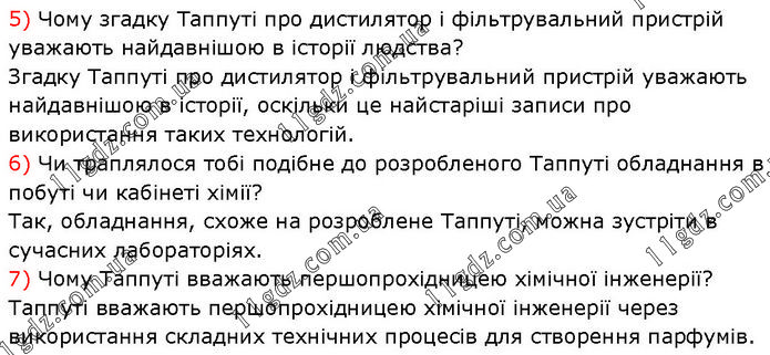 5) Чому згадку Таппуті про дистилятор і фільтрувальний пристрій уважають найдавнішою в історії людства? Згадку Таппуті про дистилятор і фільтрувальний пристрій уважають найдавнішою в історії, оскільки це найстаріші записи про використання таких технологій. 6) Чи траплялося тобі подібне до розробленого Таппуті обладнання в побуті чи кабінеті хімії? Так, обладнання, схоже на розроблене Таппуті, можна зустріти в сучасних лабораторіях. 7) Чому Таппуті вважають першопрохідницею хімічної інженерії? Таппуті вважають першопрохідницею хімічної інженерії через використання складних технічних процесів для створення парфумів.