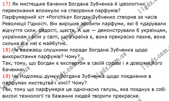 17) Як мистецьке бачення Богдана Зубченка й ідеологічні переконання вплинули на створення парфумів? Парфумерний хіт «Porichka» Богдан Зубченко створив за часів Революції Гідності. Він вирішив зробити парфуми, які б «дарували відчуття сили, радості, щастя. А ще — демонстрували б українцям, українкам і всім у світі, що Україна є, вона прекрасно пахне, вона сильна й у неї є майбутнє. 18) Чи вважаєш слушними поради Богдана Зубченка щодо використання парфумів? Чому? Так, тому, що Богдан є експертом в своїй справі і я довіряю його баченню. 19) Чи поділяєш думку Богдана Зубченка щодо поєднання в парфумах мистецтва і хімії? Чому? Так, тому що парфумерія це одночасно галузь, яка поєднує в собі високі технології та бажання людей творити прекрасне.